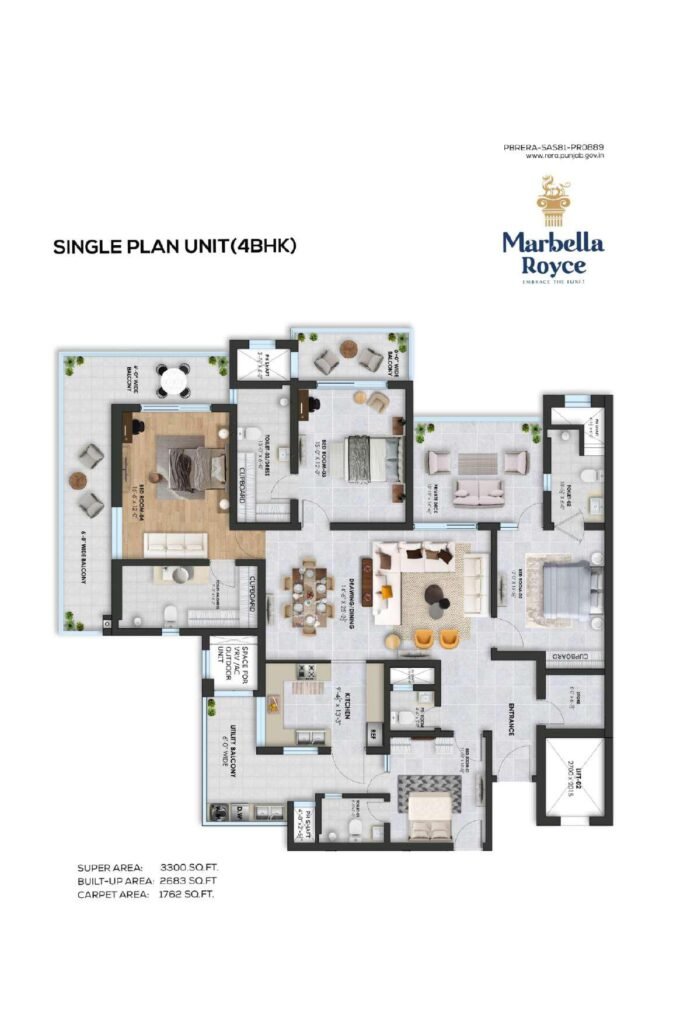 The 4 BHK in Marbella Royce offers 3120 sq ft super area (corner units: 3300 sq ft) with 4 bedrooms, 5 bathrooms, store room, and puja room. Built-up area 2503 sq ft, carpet 1762 sq ft – spacious layout with big balconies and utility space.